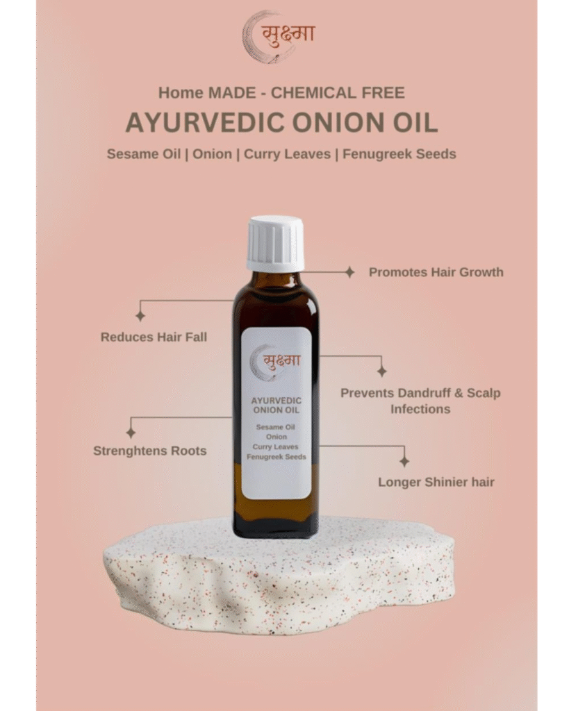 Nourish your hair with the power of Ayurveda! This homemade, chemical-free Ayurvedic Onion Oil is carefully blended with Sesame Oil, Onion, Curry Leaves, and Fenugreek Seeds, offering a natural solution for all your hair