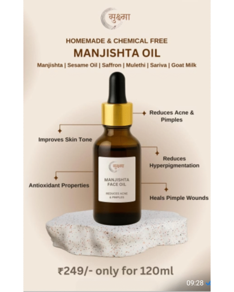 A luxurious blend of Ayurvedic ingredients crafted to nourish and heal your skin naturally. This homemade Manjishta Oil is free from chemicals and packed with skin-loving botanicals.