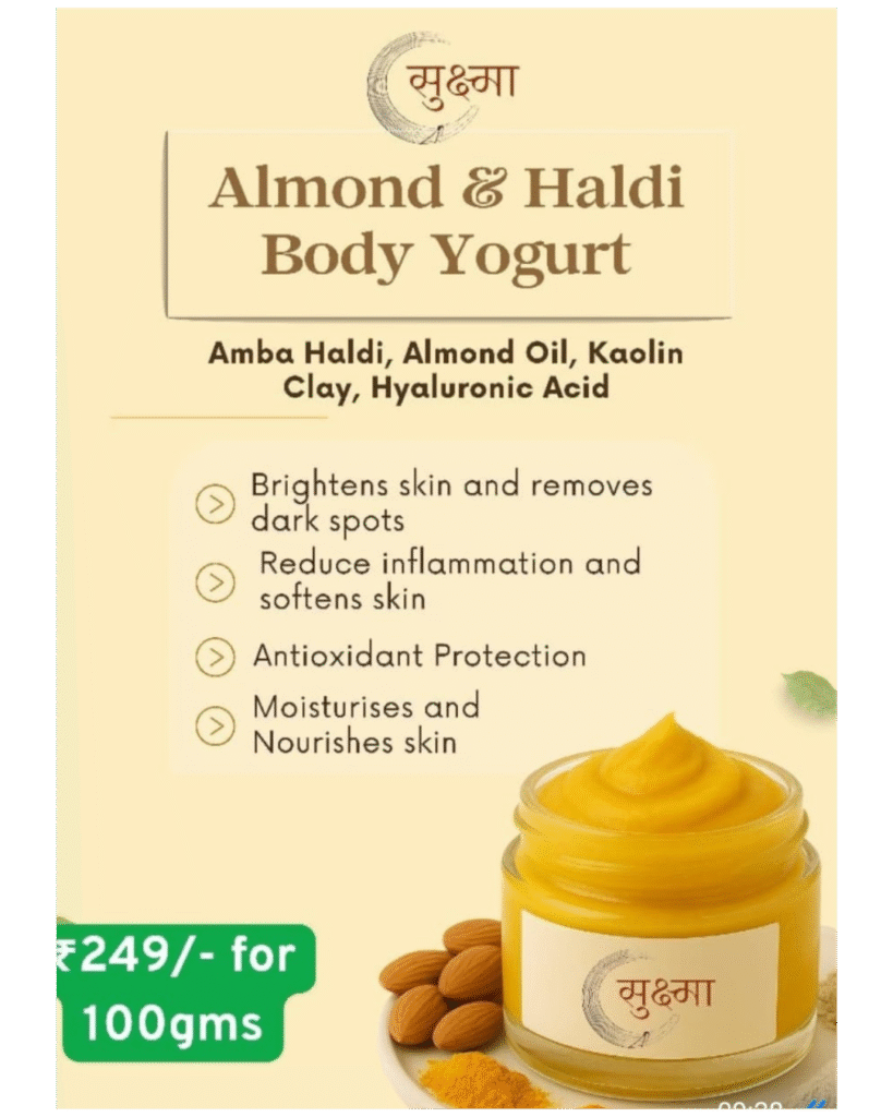 Indulge your skin in the richness of Amba Haldi, Almond Oil, Kaolin Clay, and Hyaluronic Acid with this luxurious body yogurt. Its creamy, lightweight texture melts into the skin instantly, leaving it soft, hydrated, and glowing without any stickiness.
